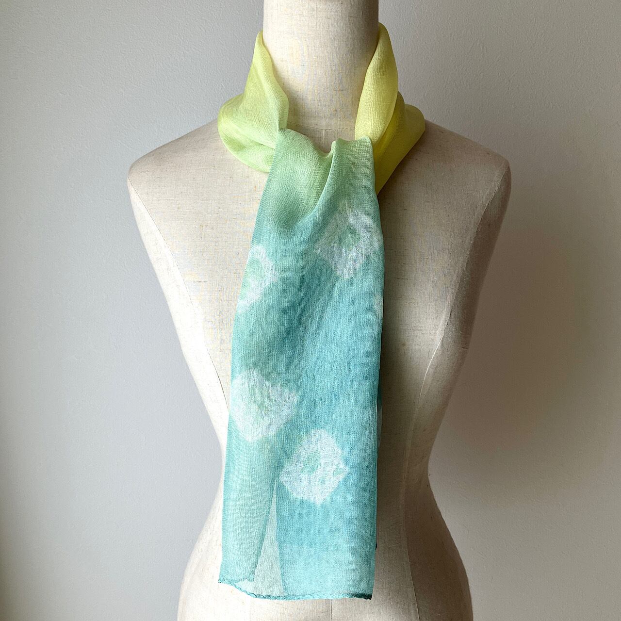絹100%の絹紗ストールをキハダと藍にて絞り染めをしました